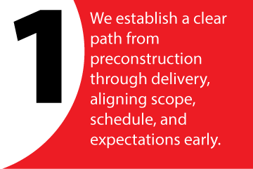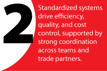 Safety is embedded in how we plan and execute, supported by leadership, training, and accountability at every level. Through disciplined systems and TAKT planning, we improve workflow, increase transparency, and reduce risk across teams and trades.